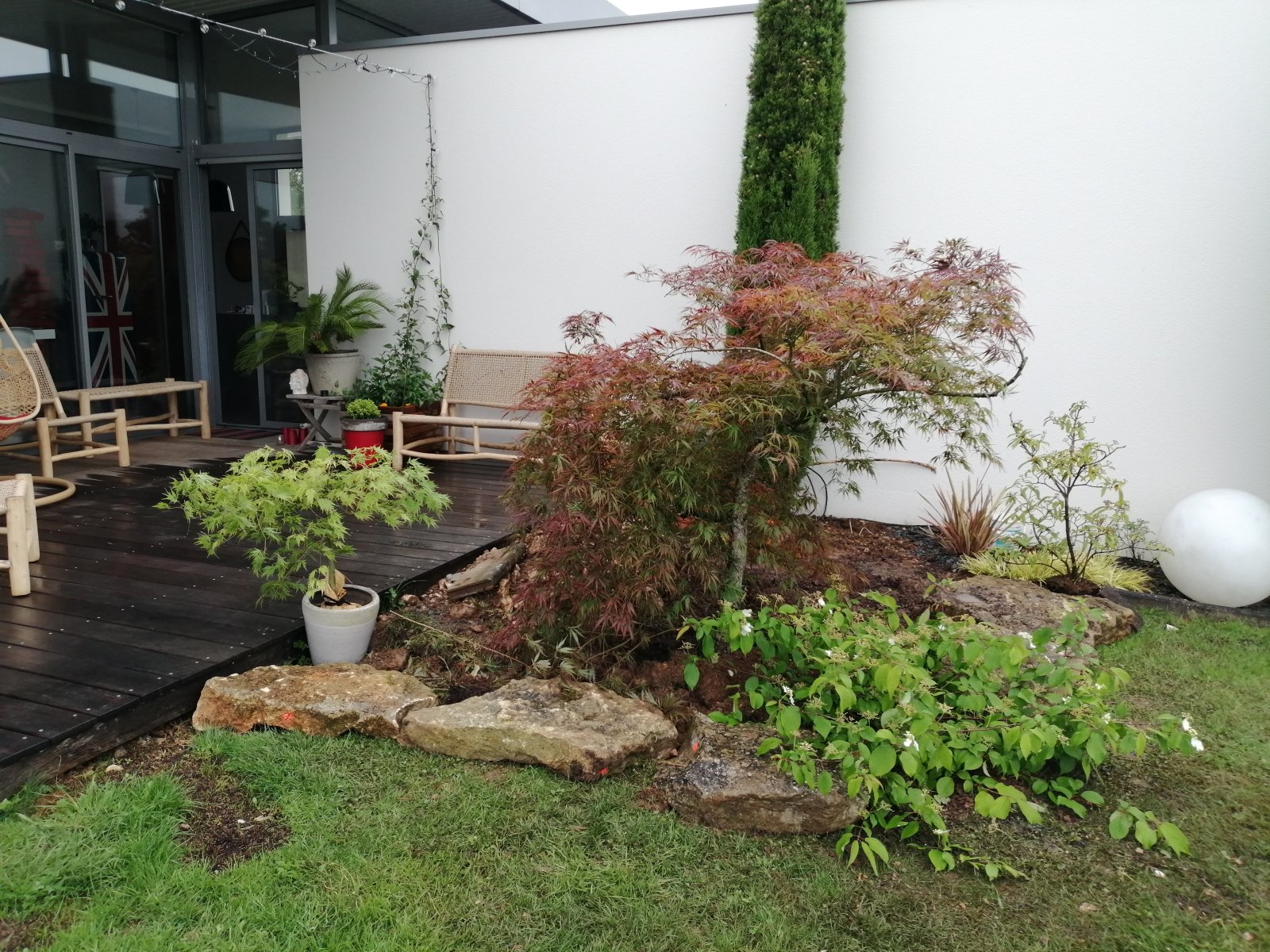 Dix petits mètres carrés sont cédés sur le gazon. Au creux d’un enrochement, des arbustes aux ramures horizontales prennent place. Ils enveloppent l’aménagement et font un contre point aux cyprés tout en préservant la vue et la lumière depuis les baies vitrées du salon. Un jasmin, un cycas et quelques pots trouvent une place sur la terrasse pour une transition végétale plus douce.