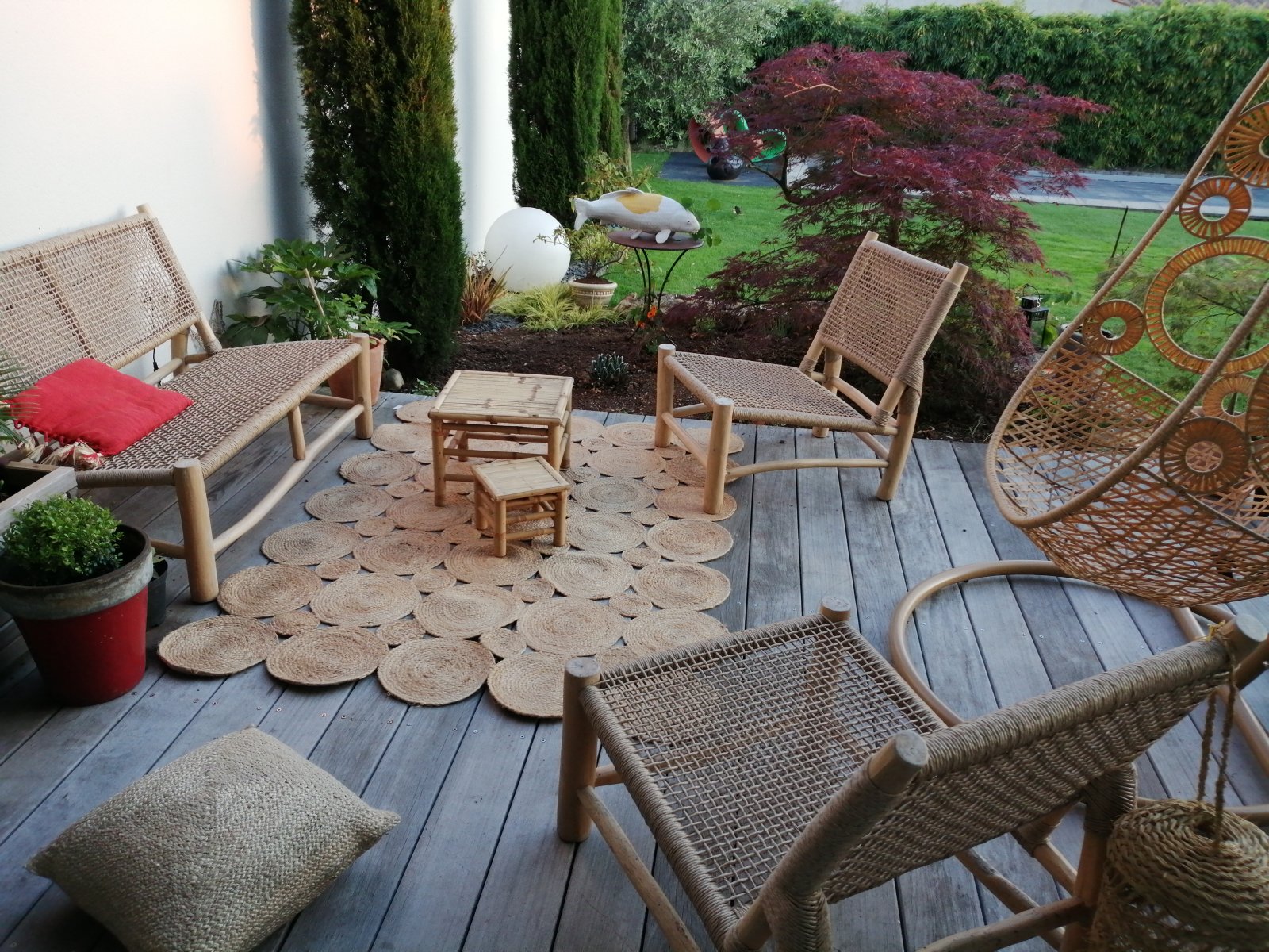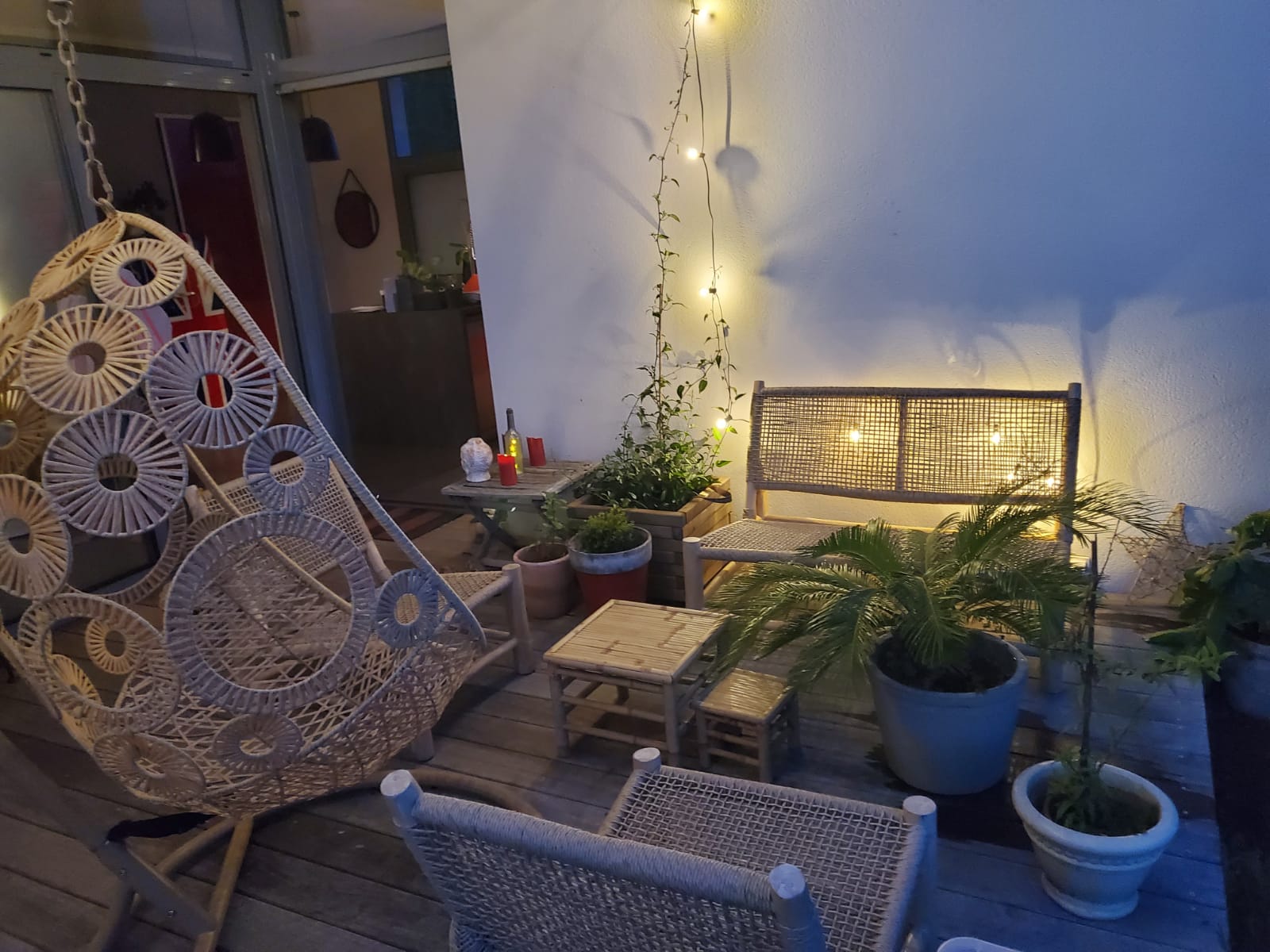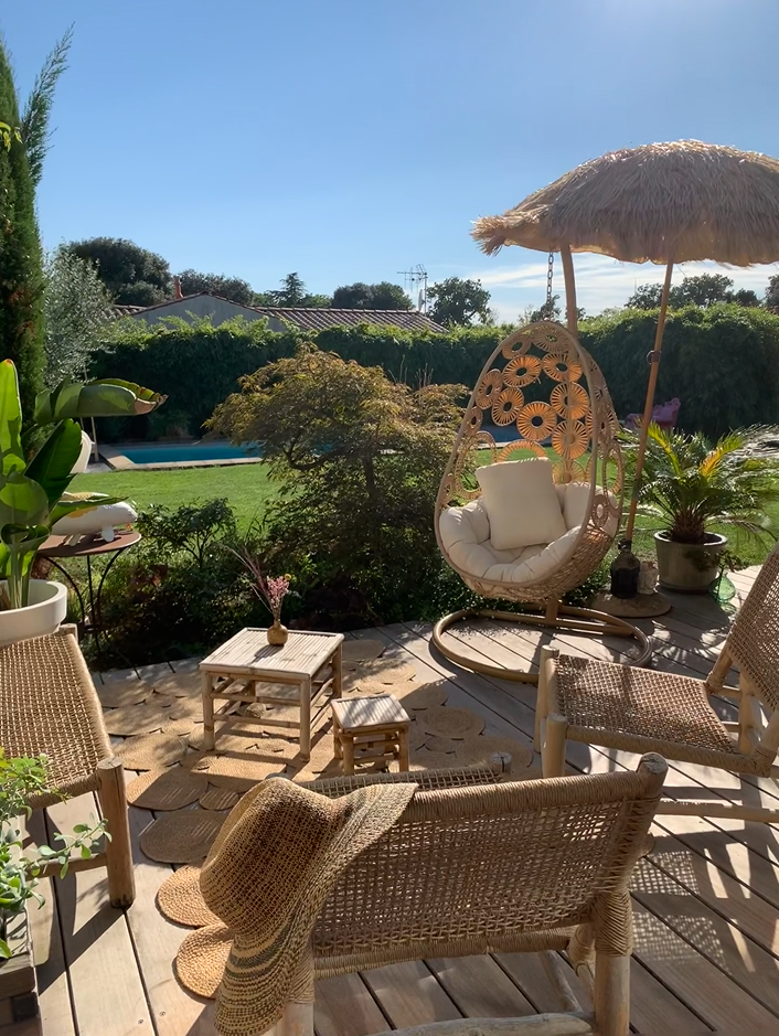 Côté mobilier, l’atmosphère est assurée par un salon de jardin en bois clair et cordes pour l’ambiance bohême. Quelques petites tables disparates et chinées contribuent à raconter une histoire. Des bougies pour le soir et un brassero pour la nuit. C’est une invitation au voyage.