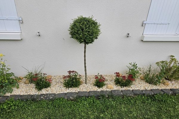Pour donner de la dynamique et contrebalancer l’effet couloir, des arbustes, des graminées de différentes hauteurs et des piquets de schiste rythment le chemin. Au pied, les bulbes sont rassemblés par zone et de nouvelles espèces aux couleurs contastées complètent le tableau.
