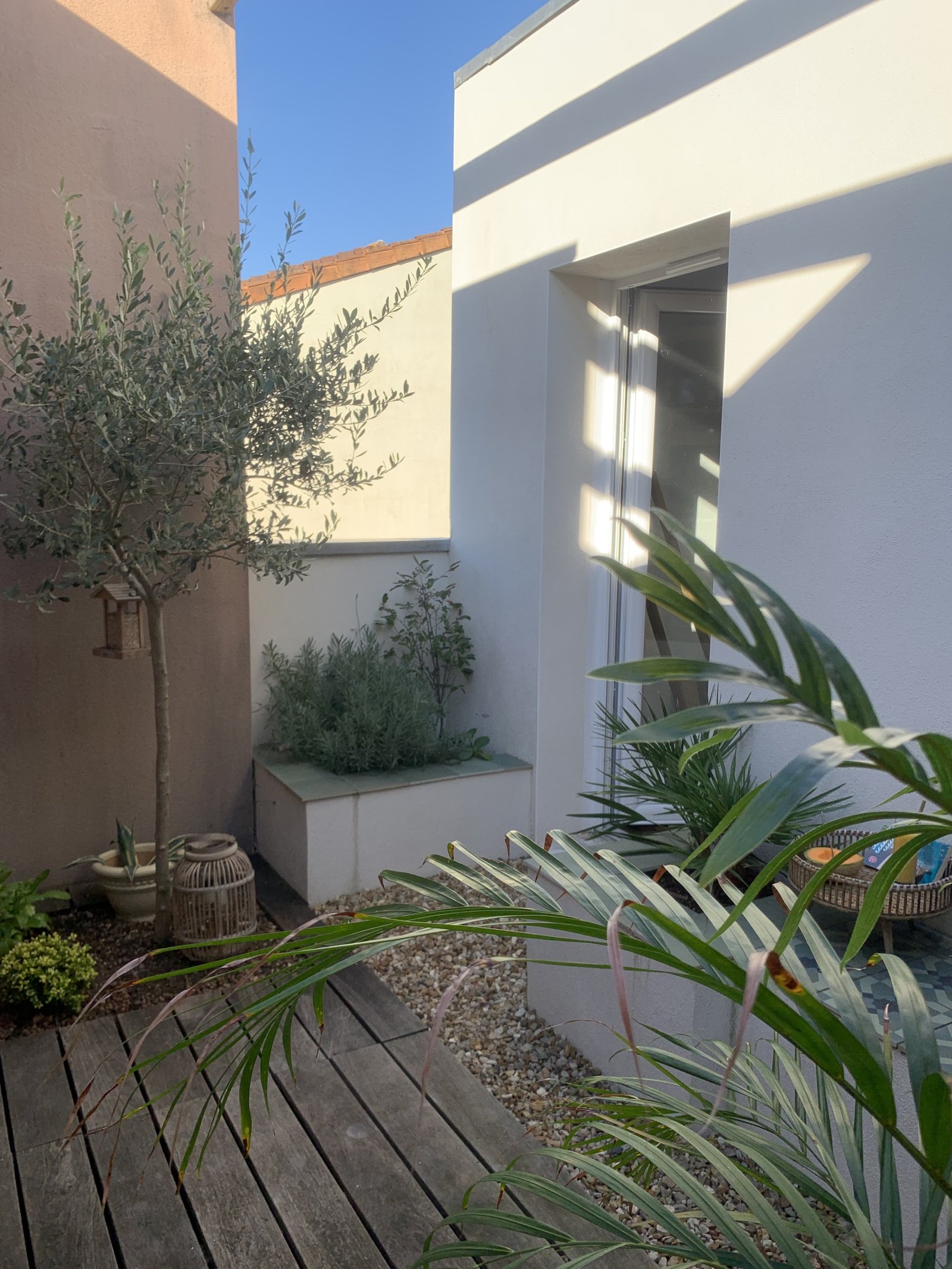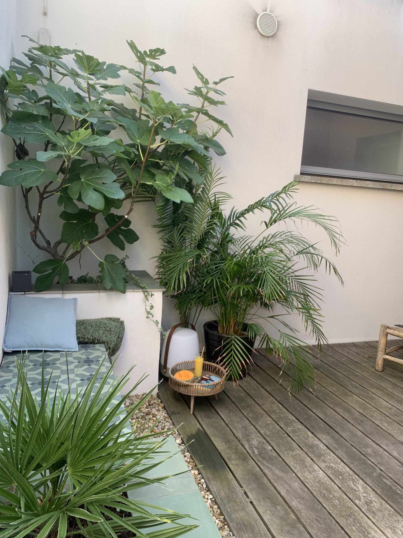 La construction d’un garage près d’une chambre a occulté la vue depuis la porte vitrée. Ces quelques mêtres carrés sont mis à profit pour faire un patio privatif. Création des bacs et du banc carrelé en terre cuite pour des couleurs toute l’année.